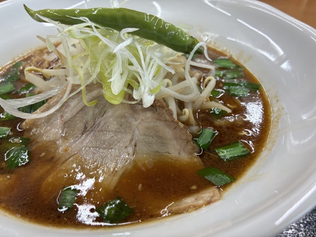 みてください……!ラーメンの頂上にドン!と緑の存在が…!!なんとなんと、てっぺんには青唐辛子が丸ごと一本乗っているんです!